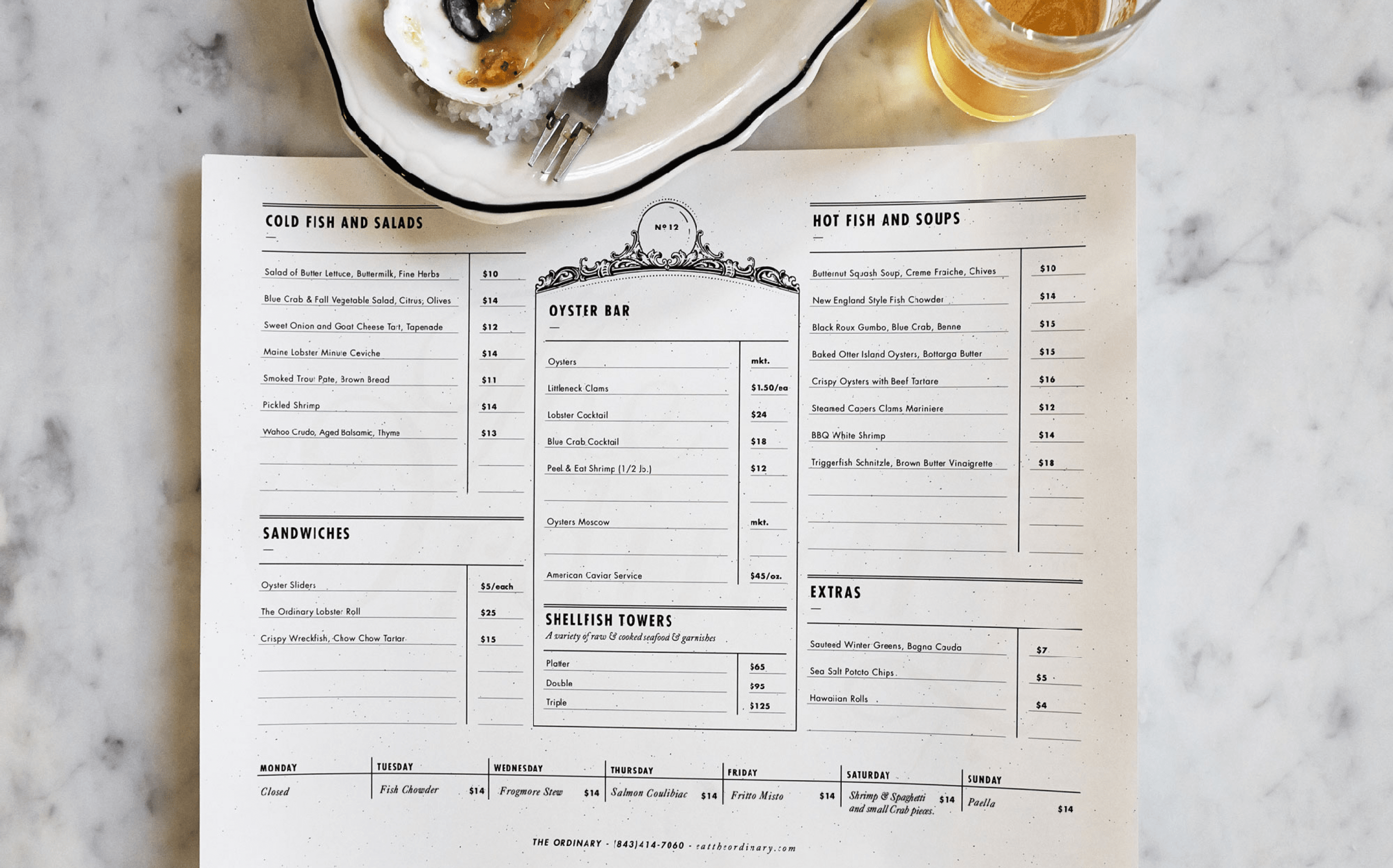 The logo is a custom script that includes a flourish that references a harpoon. Additional imagery is intended to conquer the feeling of being on the ocean at night. The identity is grayscale which allows photography of the food to stand out. The menu is set in a placemat style that allows for frequent changes and a more casual customer experience.