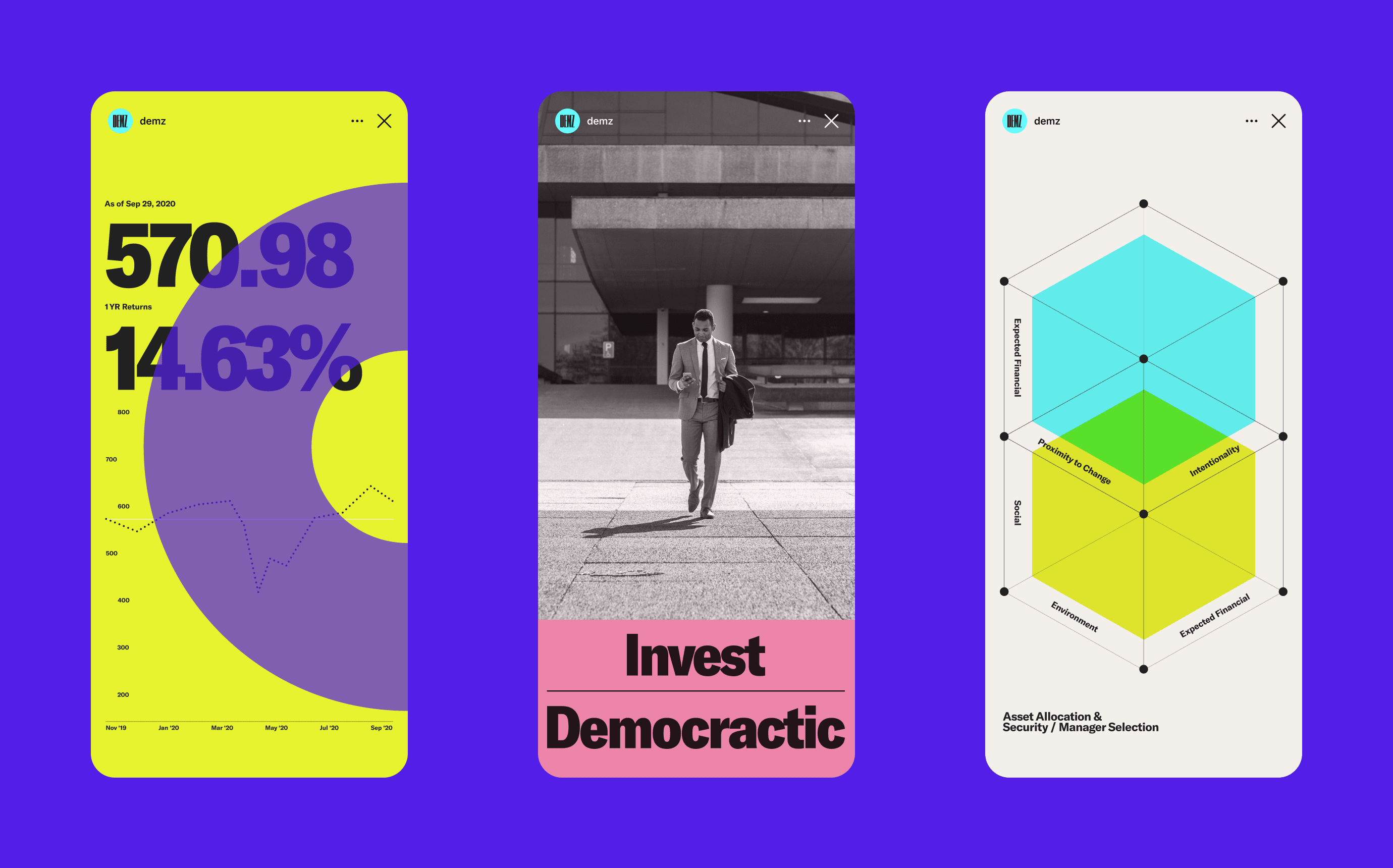 The founders of DEMZ knew that brand and messaging would be key to clearly communicating the core mission of the fund. We developed a brand narrative and visual identity around the idea of the power of the people. The visual identity is rooted in the rich history of newsprint, political posters and protest signage. We wanted to communicate trust through confident, editorial styles. The system can easily scale to tell stories that flex between financial status and the values of the Democratic party.