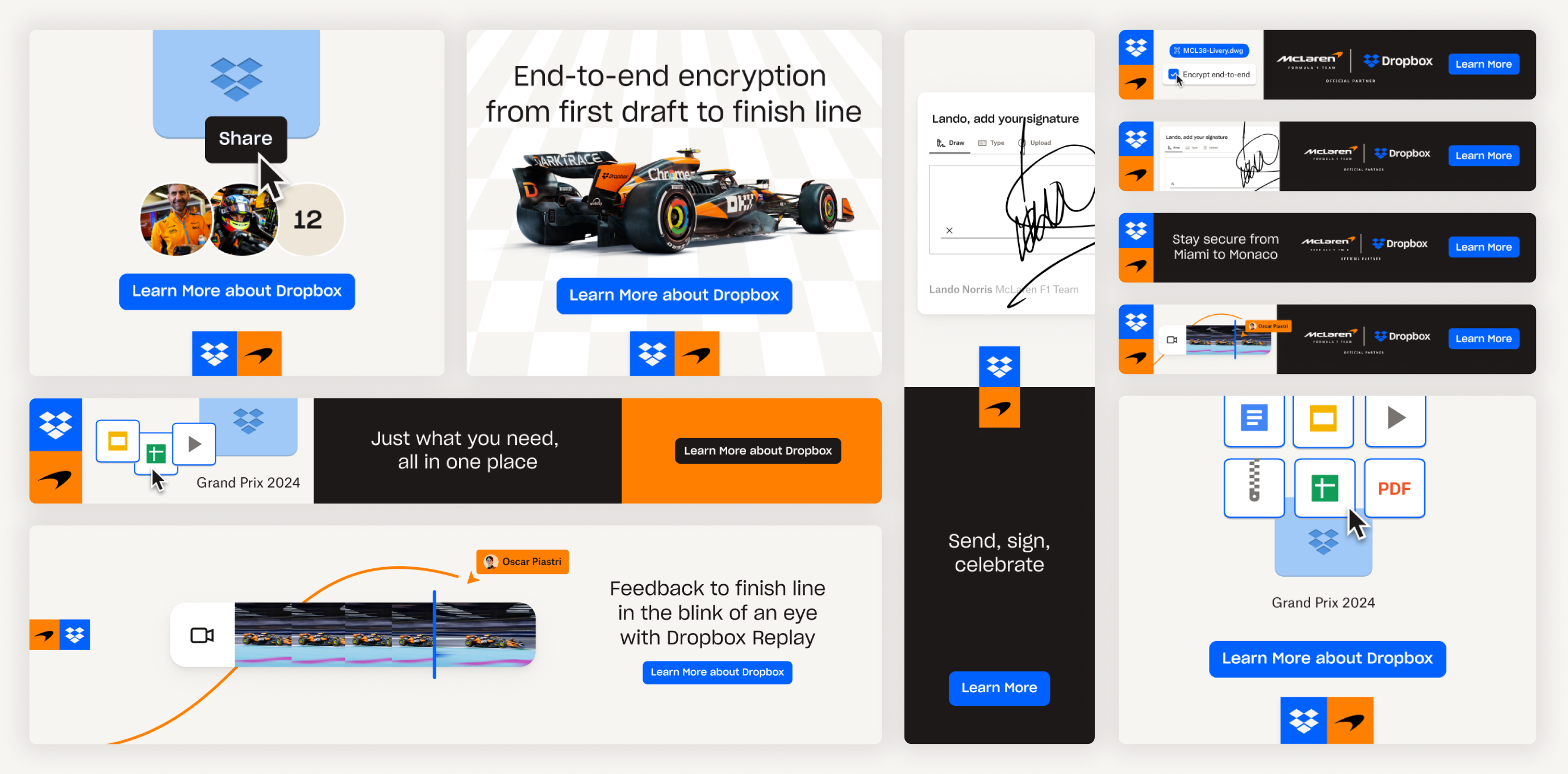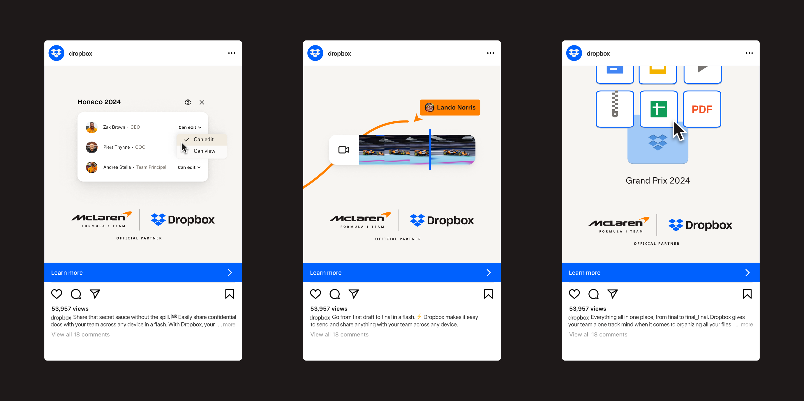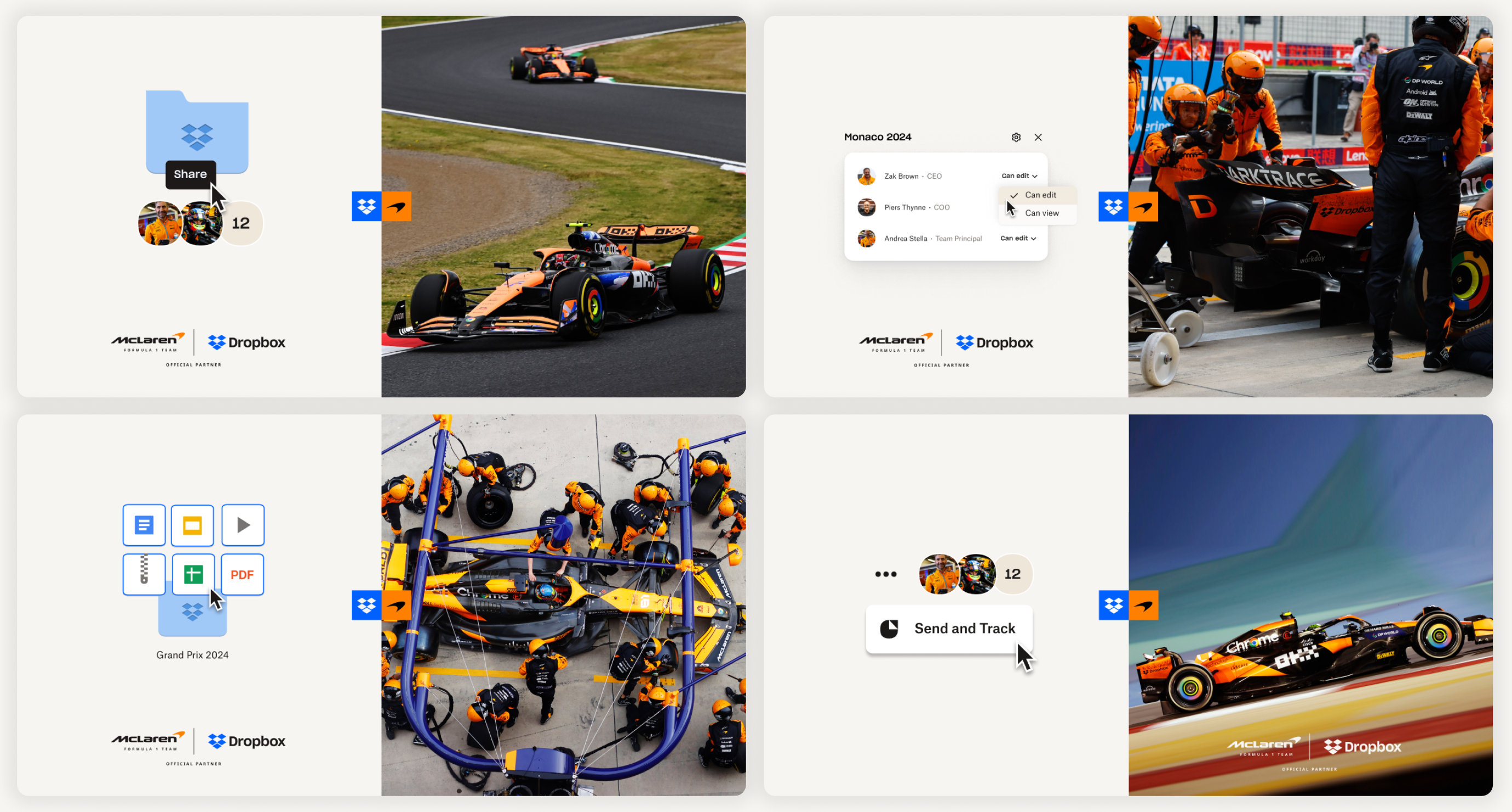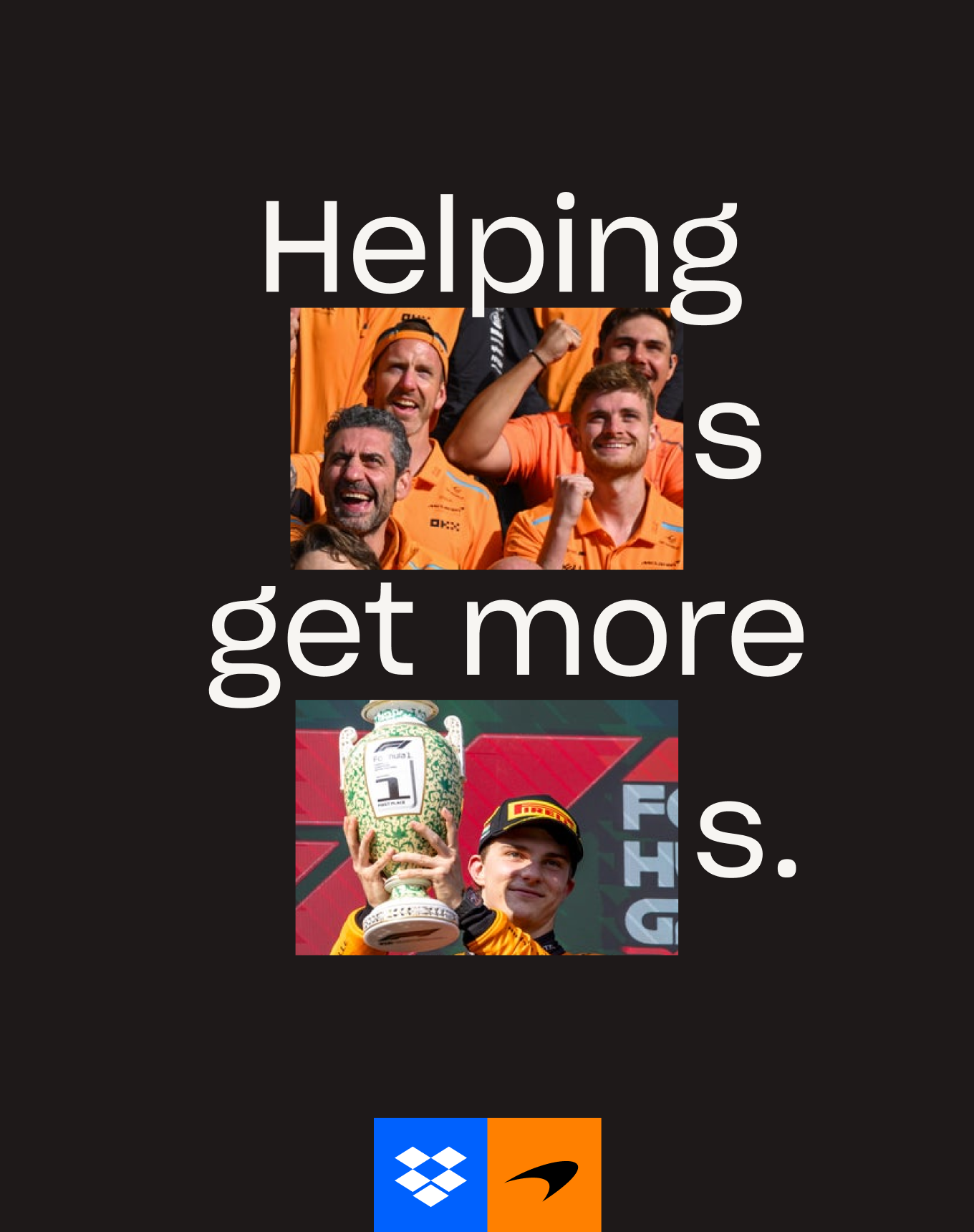 Dropbox's track record of fast, efficient, and easy-to-use products makes them a perfect partner for the McLaren Formula 1 Team. And their newest products push beyond storage, to support teams the way they work today. We help teams get the best results across the finish line. Dropbox is the one tool they rely on to stay organized and share info while safeguarding their business-critical content.