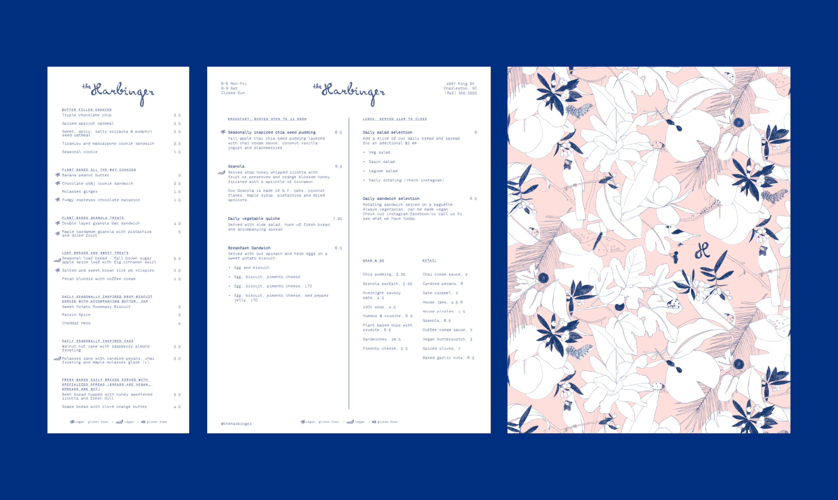 The Harbinger is a cozy cafe in an emerging neighborhood in Charleston. We created an identity system, various illustrations, packaging and signage that plays to the humble yet decadent nature of the place, it's offerings and local environment.