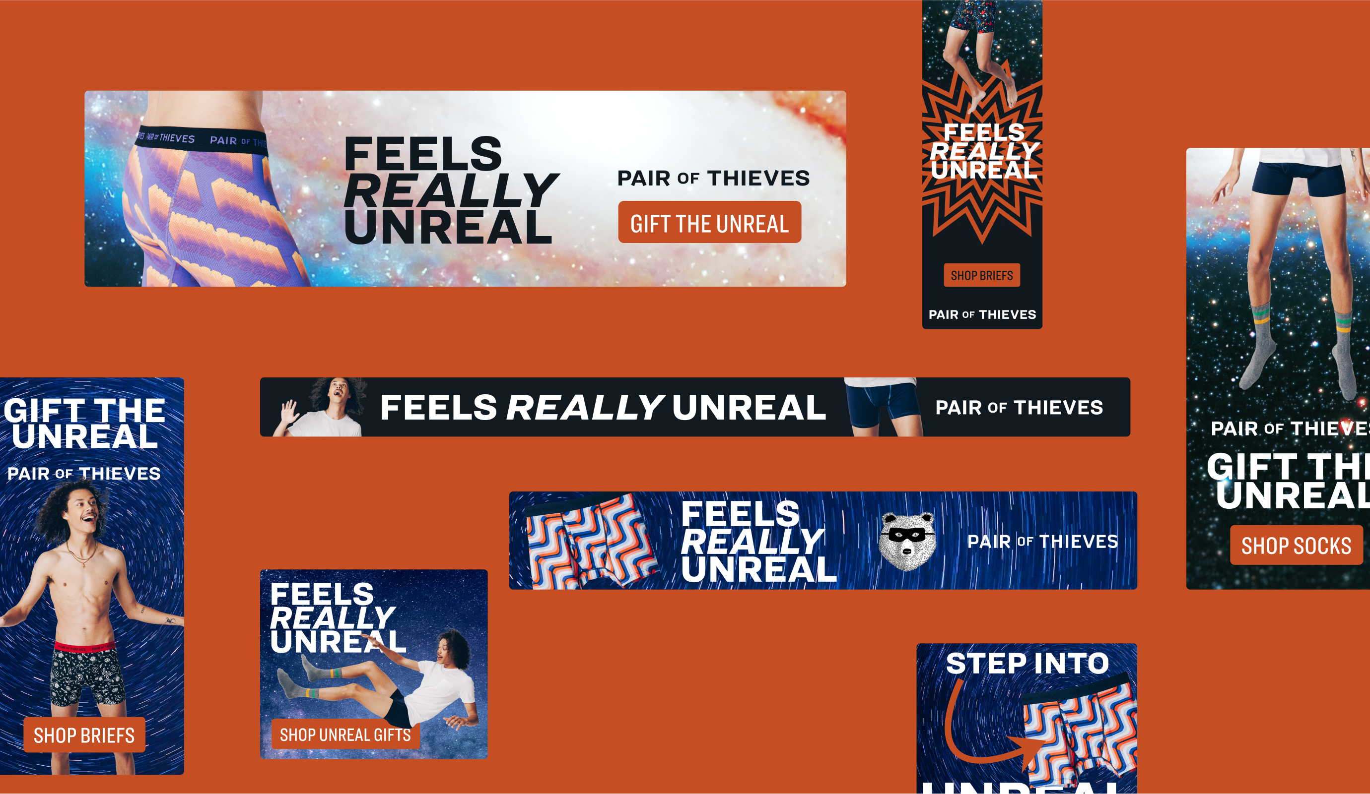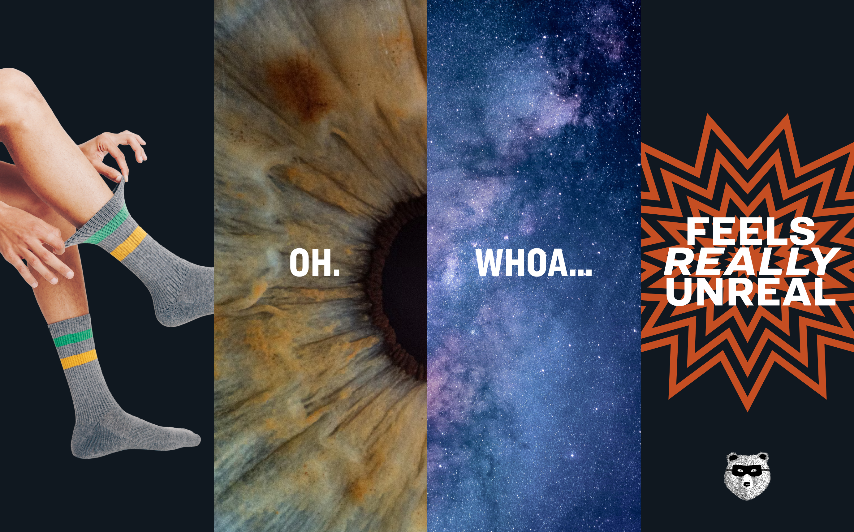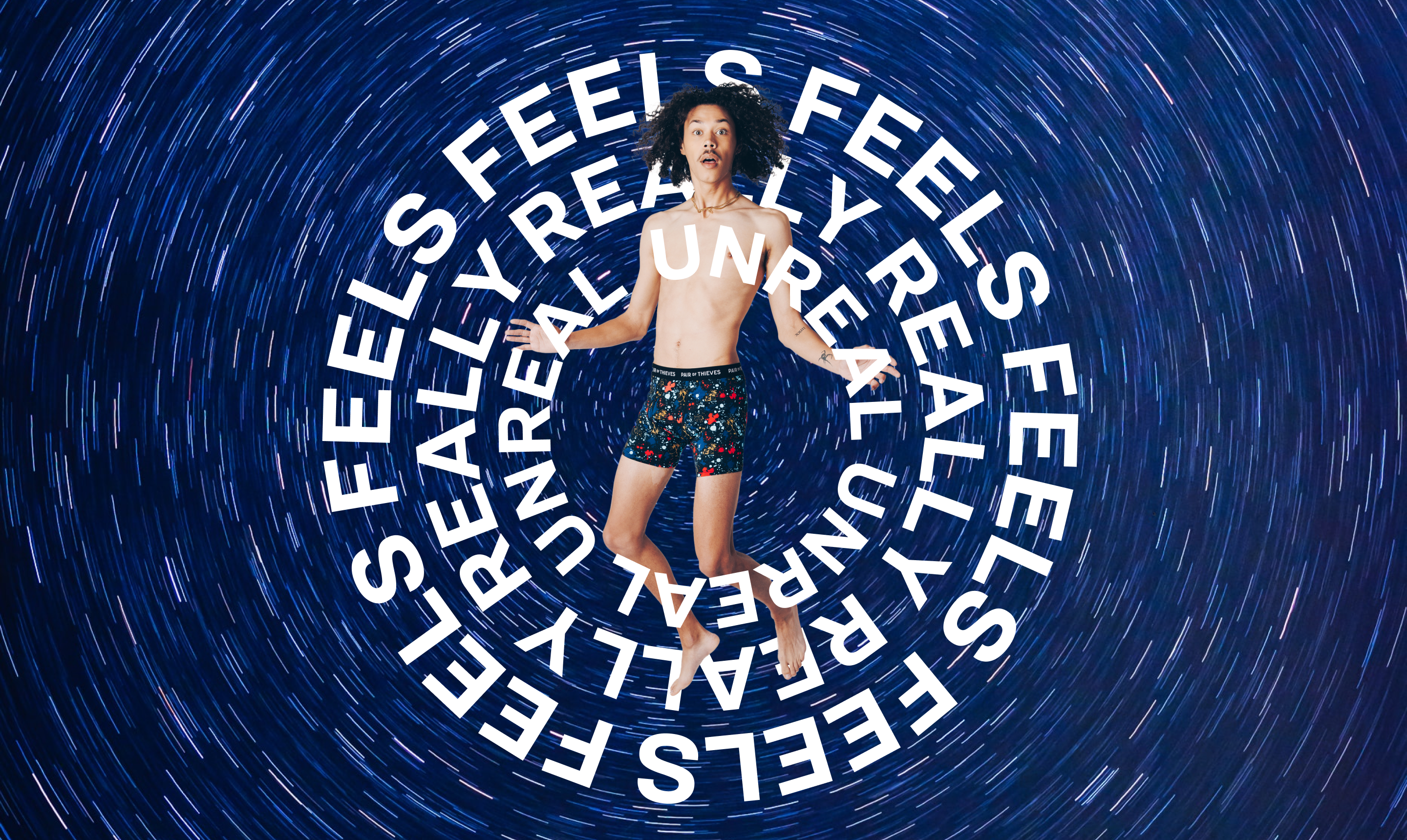 We developed campaign concepts to explore different ways to get at this core emotional experience and all aligned on the idea of "feels really unreal." To really hone in on that idea we identified the key moment when you realize something special is happening – the snap! of the underwear band. In that moment you're thrown into a portal traveling through experiences you've never dreamed of, all represented by found imagery and audio and speaking to the quality of the product.