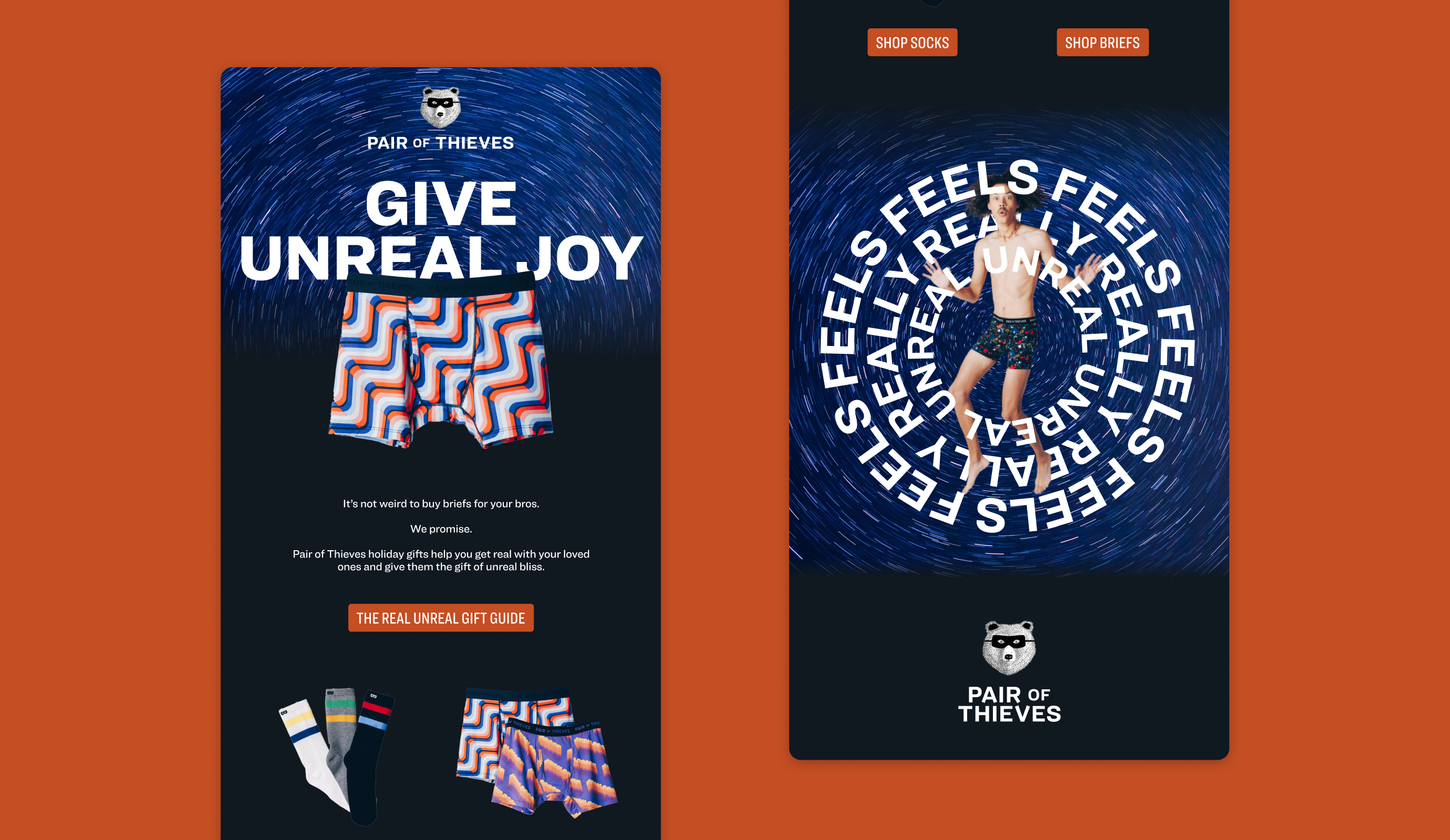 Pair of Thieves, the underwear brand flying off the shelves of Target and Walmart, approached us to partner with them on a holiday brand campaign that elevated their marketing approach out of product features and conversion and focused more on the emotional experience of putting on the best pair of underwear and socks out there.