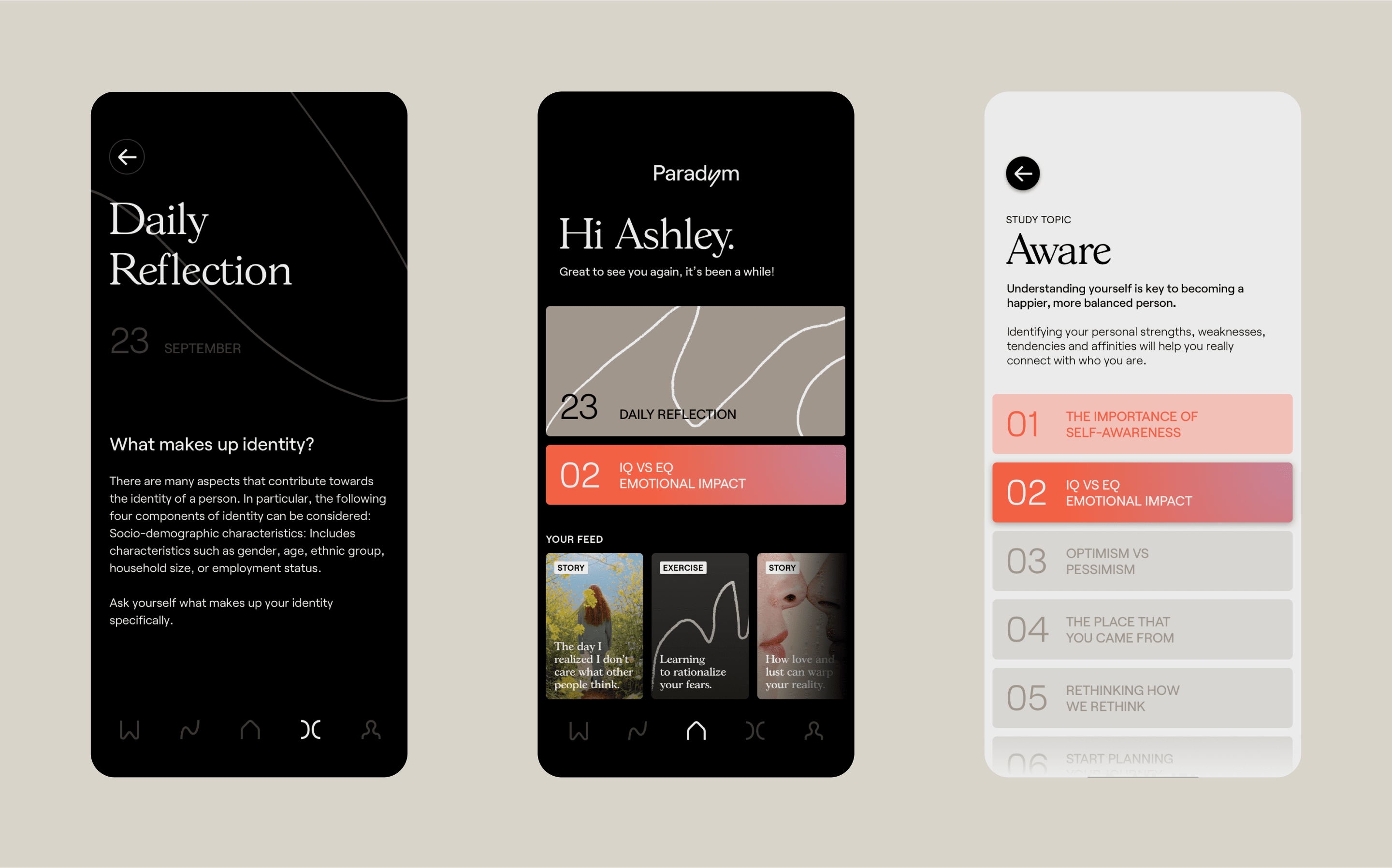 As the future-facing trend of the quantified self expands from fitness into wellness and mental-health spaces, the challenge at hand for Paradym was to fundamentally shift how to approach accomplishment and growth through a more empathetic and authentic lens. The pursuit of greater self-awareness leaves ego at the door in exchange for vulnerability and honesty; users want a brand they can build trust with.