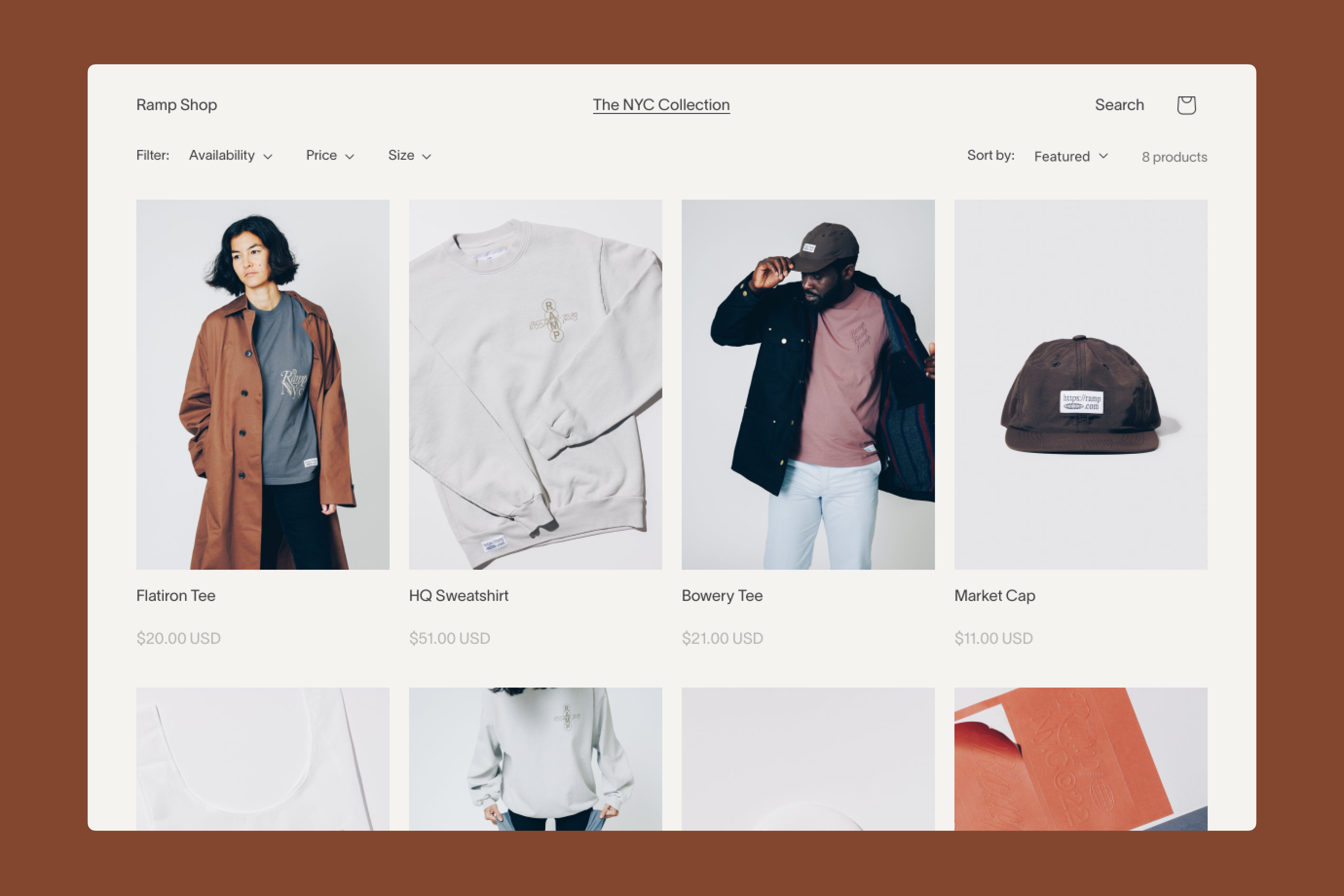 We worked closely with Ramp to develop concepts for a line of company branded merchandise that went beyond just putting the logo on a shirt and drew more inspiration from the place where they were founded: New York. Then, we built a new online storefront for the fashion and lifestyle inspired line to live and grow on, making all of the goods easily available to employees of Ramp, whether they were in New York or anywhere else. Ny.©22