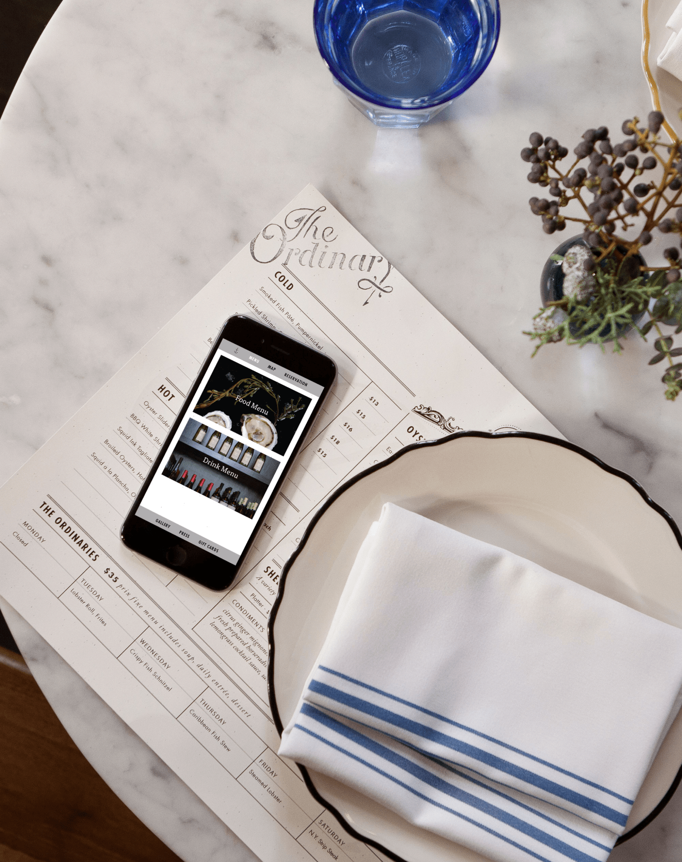 The logo is a custom script that includes a flourish that references a harpoon. Additional imagery is intended to conquer the feeling of being on the ocean at night. The identity is grayscale which allows photography of the food to stand out. The menu is set in a placemat style that allows for frequent changes and a more casual customer experience.